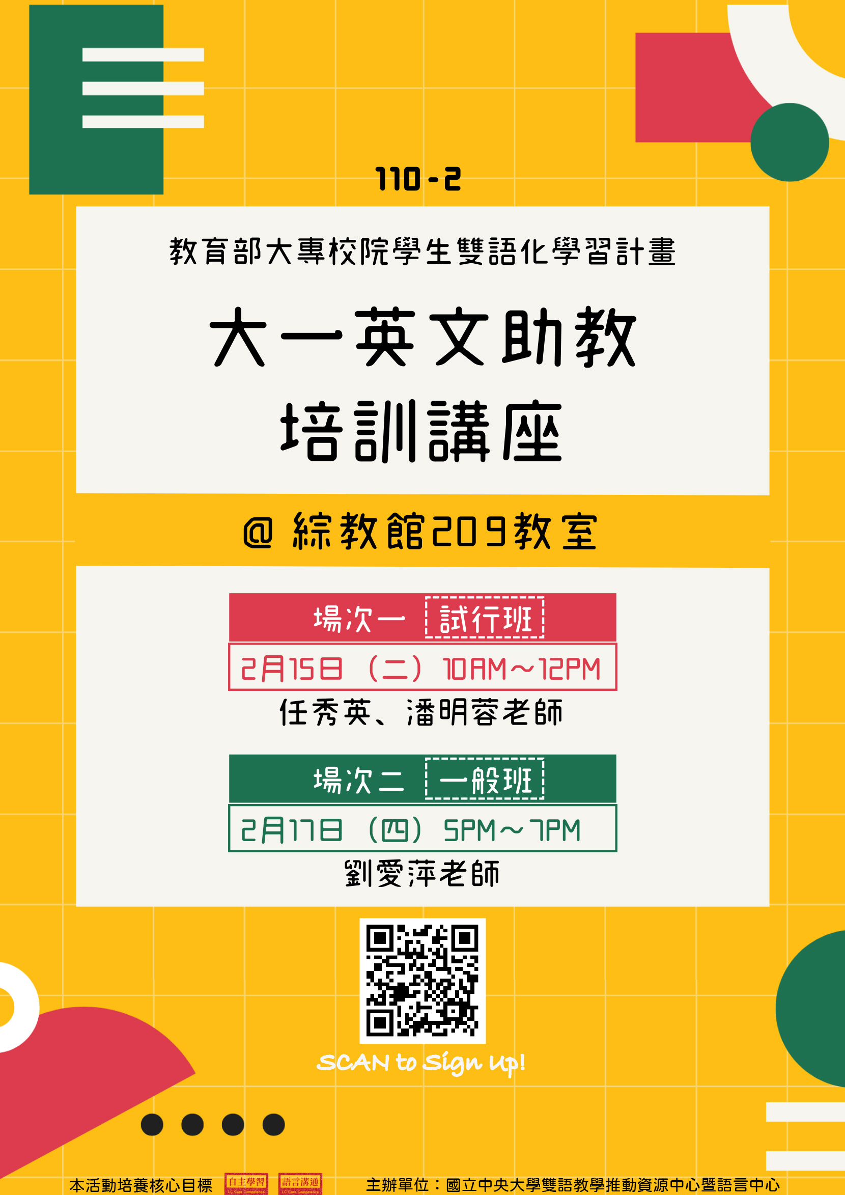 Established in 2022, NCUBEC is devoted to effectively executing the BEST program by the Ministry of Education. Collaborating closely with the Key Cultivation Colleges in BEST, NCUBEC strives to integrate the administrative support and teaching resources school-wide. Through creating a bilingual immersion environment, our Center aims at further fostering students’ abilities in autonomous learning and strengthening their global competitiveness, in order to meet the mission of the Bilingual 2030 Policy.