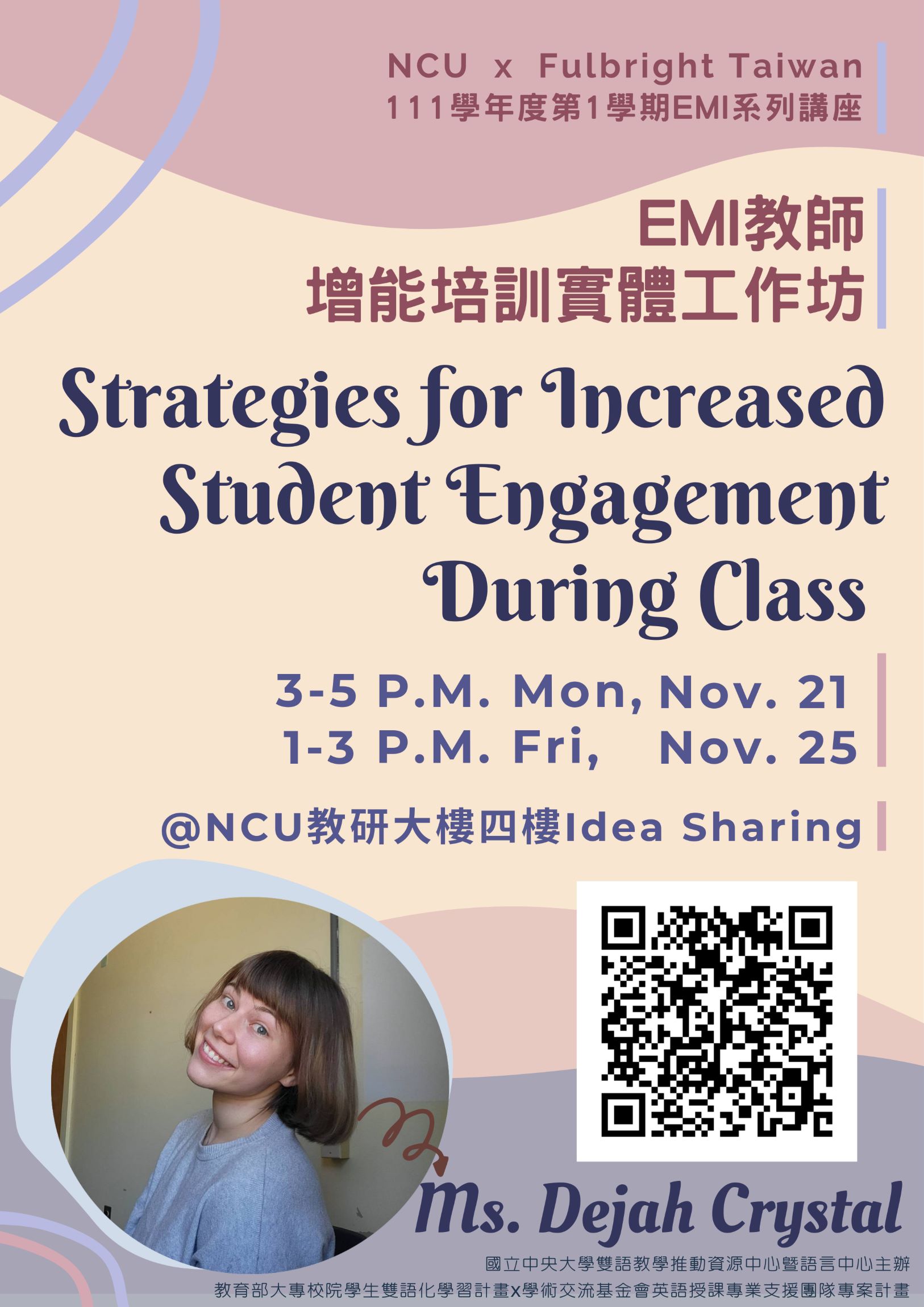 Established in 2022, NCUBEC is devoted to effectively executing the BEST program by the Ministry of Education. Collaborating closely with the Key Cultivation Colleges in BEST, NCUBEC strives to integrate the administrative support and teaching resources school-wide. Through creating a bilingual immersion environment, our Center aims at further fostering students’ abilities in autonomous learning and strengthening their global competitiveness, in order to meet the mission of the Bilingual 2030 Policy.